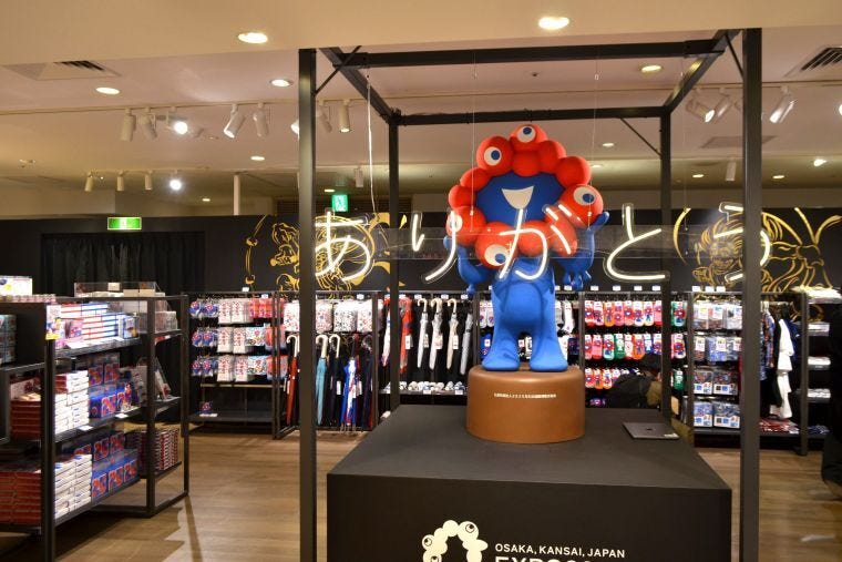 会場外では、あべのハルカス近鉄本店や大丸大阪・梅田店、高島屋大阪店などに公式ストアを開設。ミャクミャクのキーホルダーやぬいぐるみ、箱に絵柄があしらわれた菓子類などを購入する人で連日にぎわいを見せた。