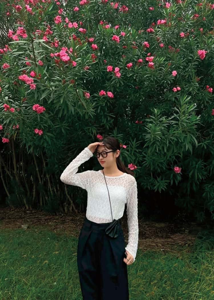 「指にはカルティエのトリニティリング。おでかけに欠かせないアイテムです。場所や季節を取り入れながら、気分にあうお洋服を楽しんでいます」