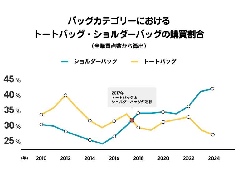 働き方やライフスタイルが多様化するなか、バッグやシューズの人気傾向にも変化があった。10年代以降、トートバッグの販売構成比が15ポイント減少した一方で、ショルダーバッグが20ポイント増加した。その理由を、「スマートフォン操作の増加や移動中の使いやすさを重視する行動の変化があったから」と指摘している。