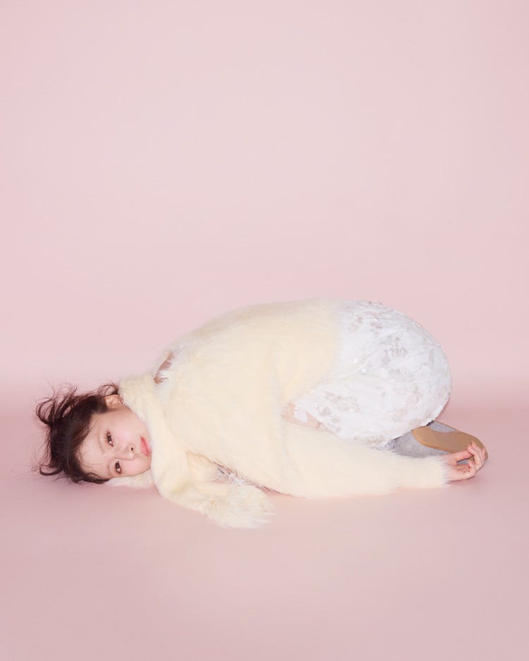 思わず抱きしめたいし、守りたい♡ ひよこみたいな淡いイエローのシャギーニットは、ストールつきで顔まわりまでもふもふに♪