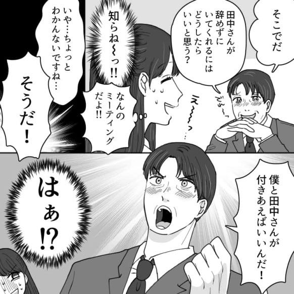田中さんを気に入り、どうしても辞めてほしくない上司の吉田さんは「田中さんと付きあえばいいんだ!」と仰天発言をします。