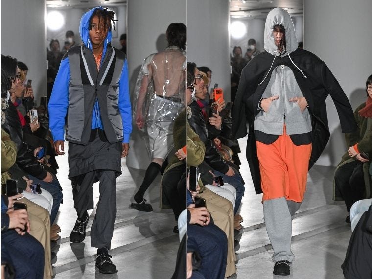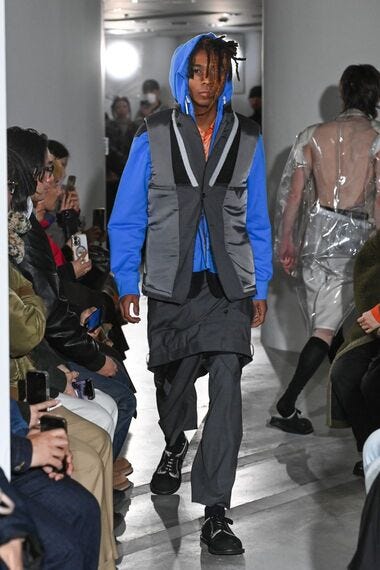 テーマは「ビヨンドリフレイミング」。視点の転換に着目し、普遍的なフォーマルウェアをユニークな構造やレイヤードスタイルで見せた。リジットデニムの袖が付いたスウェットの下には、鮮やかなブルーのシャツ。フーディーにはテーラードジャケットの身頃をインサイドアウトしたパッデッドのベストを重ねる。ストリートとワークのベーシックアイテムの一部を交じえ、違和感のない形へと変容させていく。艶のあるフォーマルの質感、構築的なディテールがアクセント。