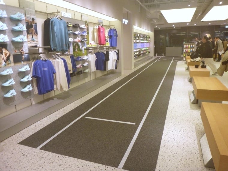 グランフロント大阪店はランニング用品を中心に、テニス、バスケットボールに加え、「アシックススポーツスタイル」のスニーカーを拡充。売り場には実際に走って履き心地を確認することができる約20メートルの試し履きトラックを新設し、走行時のフィット感やクッション性、グリップ力を実感できるようにした。