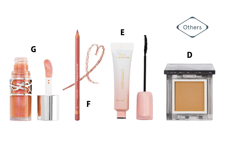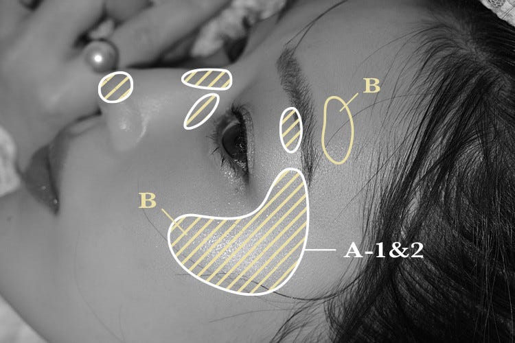 を混ぜてCゾーンにブラシでしっかりめにつけて、そのままこめかみまで広げる。同じカラーを小さめブラシにとり、鼻根と目頭、眉下、鼻先にポイントづけ。B