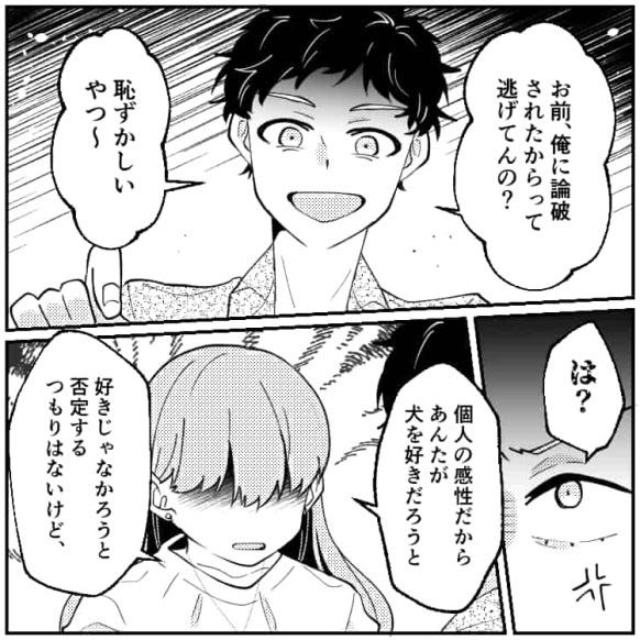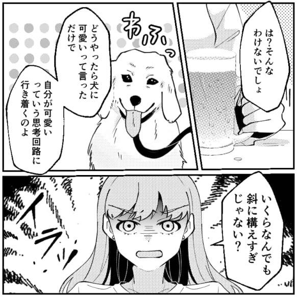 するとその後同じサークルの男子に「犬可愛いって言ってる自分が可愛いとでも思ってんの?」と衝撃的な発言をされ、驚く主人公。