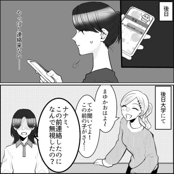 後日彼女と遊ぶ約束をしていたまゆかは、ナナミに集合時間を聞くも、なかなか返事が来ません。