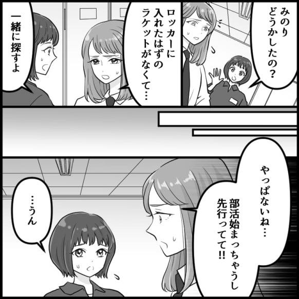 ある日みのりが部活に行くと、ラケットがありませんでした。