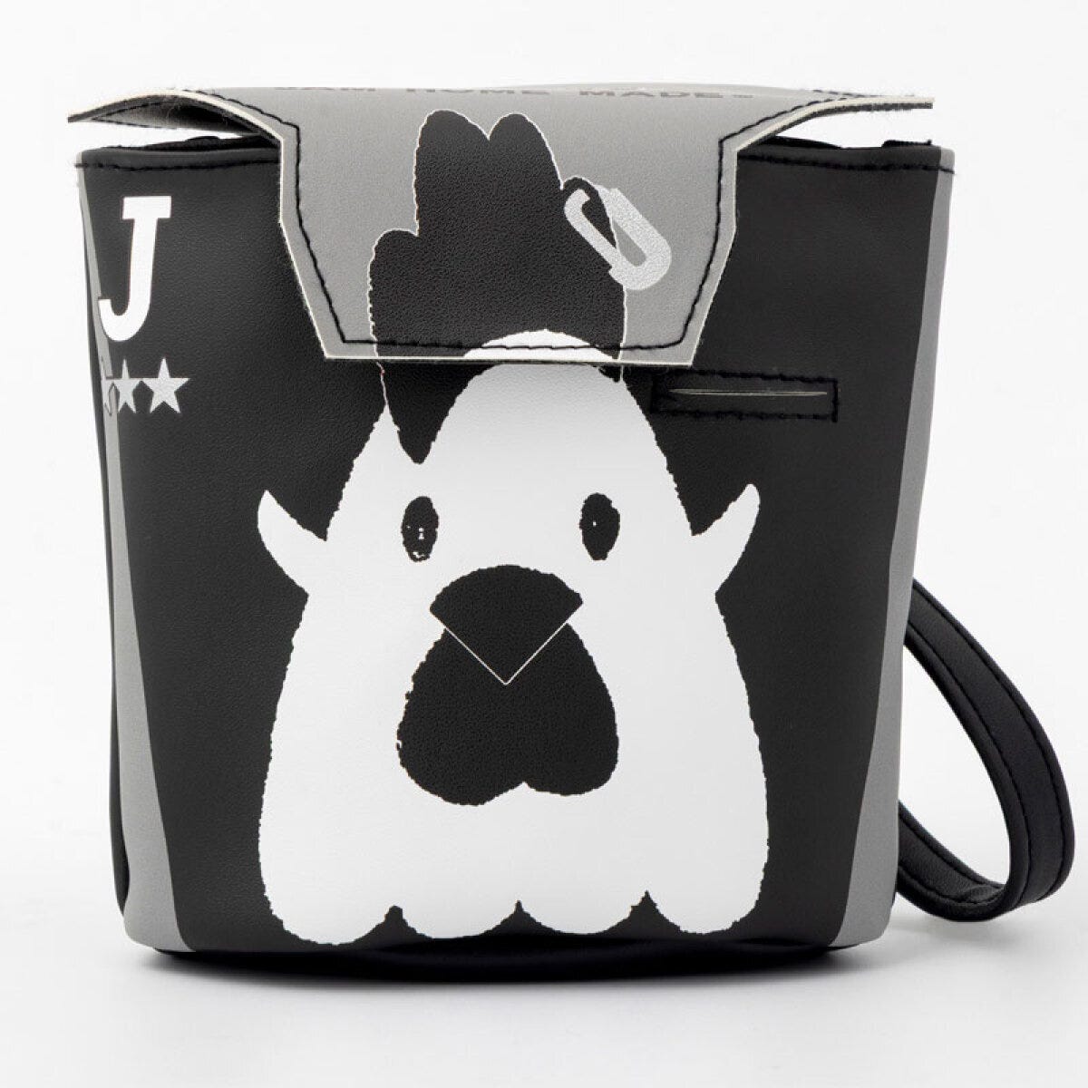 「からあげクン」のパッケージの形はそのまま、ジャムホームメイドのアイコン“安全ピン”モチーフやシルバーチャームを取り入れた本誌特別デザインのポーチはコラボならではのブラックデザイン。