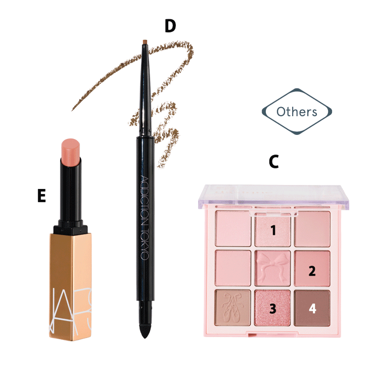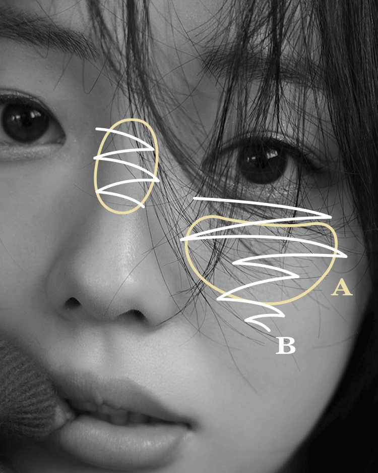 を指にとり、ほおの高め&横長に広くなじませて、鼻根付近にもつける。B