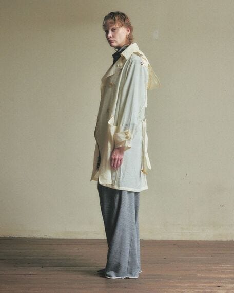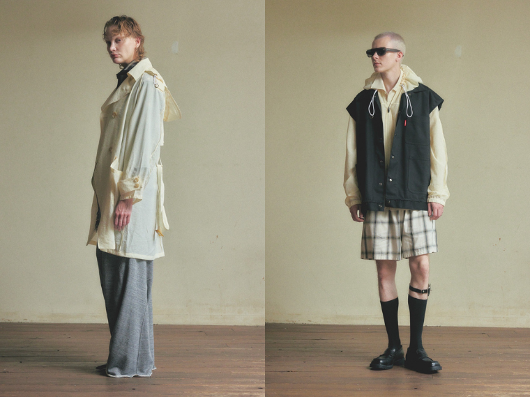 26年春夏は豪雨や猛暑など、どうしようもない日常生活に対応できるよう、ミリタリー要素を取り入れたトレンチコートはキュプラ・ナイロンのシアー素材を使い、軽さと透明感を表現した。着脱可能なフードやエポーレットカバーを付けるなど機能性を追求するとともに、アウトシームの袋縫いによって耐久性も高めた。税抜き7万2000円。同素材のミリタリーパーカも出す。ブランド定番のイージーショーツ(2万8000円)とシャツは、播州織のオンブレチェックを採用した。