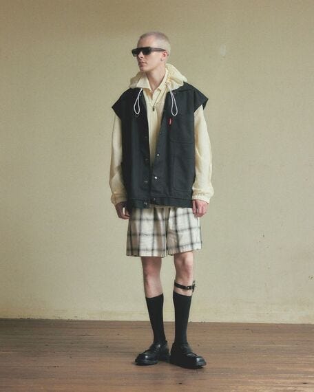 綿100%の四重ガーゼを縮絨(しゅくじゅう)した生地をミリタリーやワークの要素で再構築しカバーオールやポロシャツ、羽織れるブランケットなどを作った。その生地を京都の職人が一点ずつ墨染めした特別版(カバーオールで6万3000円)もある。そのほか、イージーケア性に優れたポリエステル・綿でクラシックなワークジャケットを短丈にしたり、エンジニアベストをオーバーサイズにしたりと現代的な解釈で提案する。ベストのアームホールはテーラーリングの技術を駆使し立体的に仕上げた。