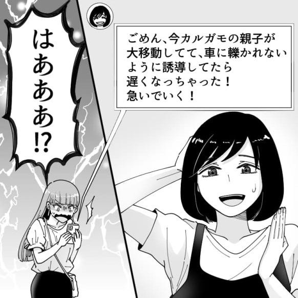「カルガモ親子の大移動の誘導をしていた」と、明らかにわかるウソをつかれて頭を抱える主人公。