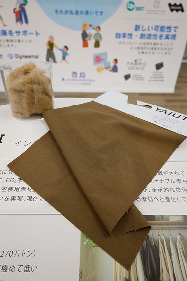 インドのリジェネラティブコットンも披露。現地農家を支援するNPO(非営利組織)やGHG(温室効果ガス)削減・定量化に実績を持つパートナーと3社協業し、農地・農業を再生する現地調達モデルを構築。土壌改善などを行うほか、綿花栽培から製品化までトレーサビリティー(履歴管理)を確保し、二酸化炭素排出削減・除去量などの算定を行う。関心を持ったブランドに即時に提供できる体制を整えた。