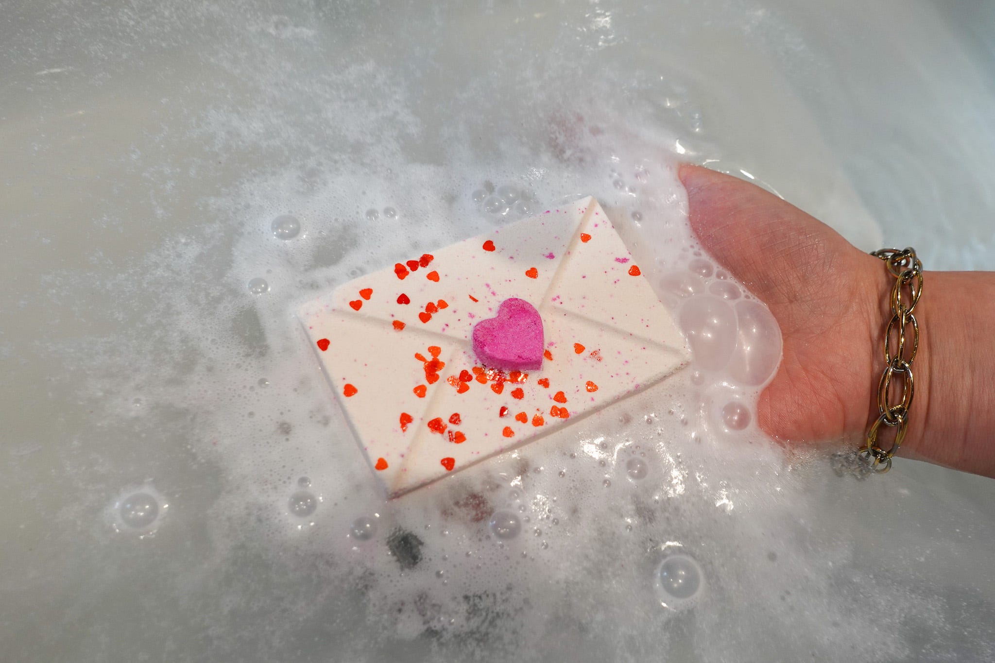 さらに、バレンタイン限定のバスボムは、お湯に入れた瞬間に色彩とラメがドラマチックに広がるタイプも。バスルームいっぱいに甘い香りが広がり、ロマンチックなバスタイムを演出してくれそうです。