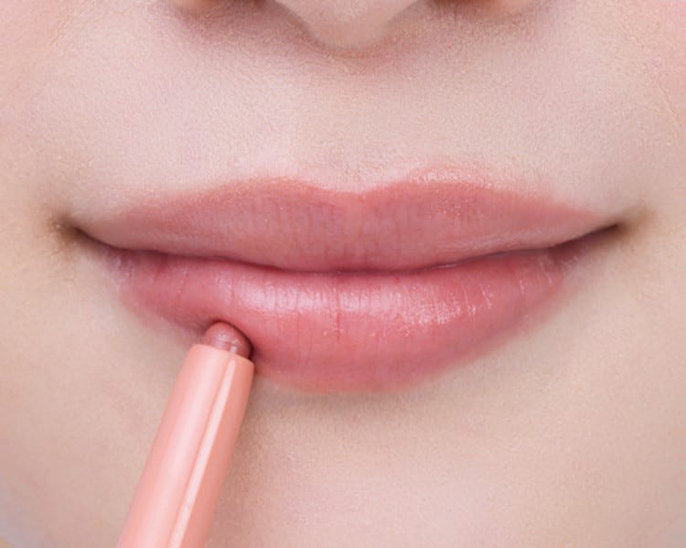 で丁寧になぞる。下唇のみ、幅広めの線にすると、ふっくら感が増して見える。粘膜カラーなら、重ねたリップが落ちてしまったときもラインが浮いて見えない。