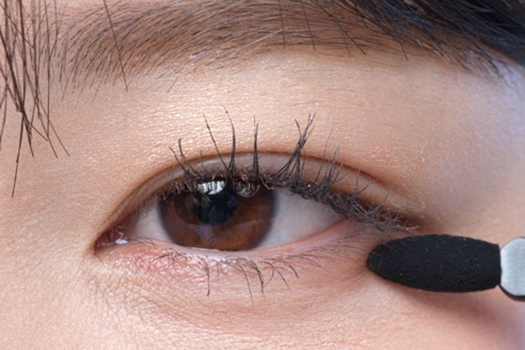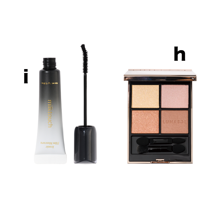 右上→右下の順で塗り重ね、淡い影をつけて自然に目幅を拡大させて。まつ毛は、i
