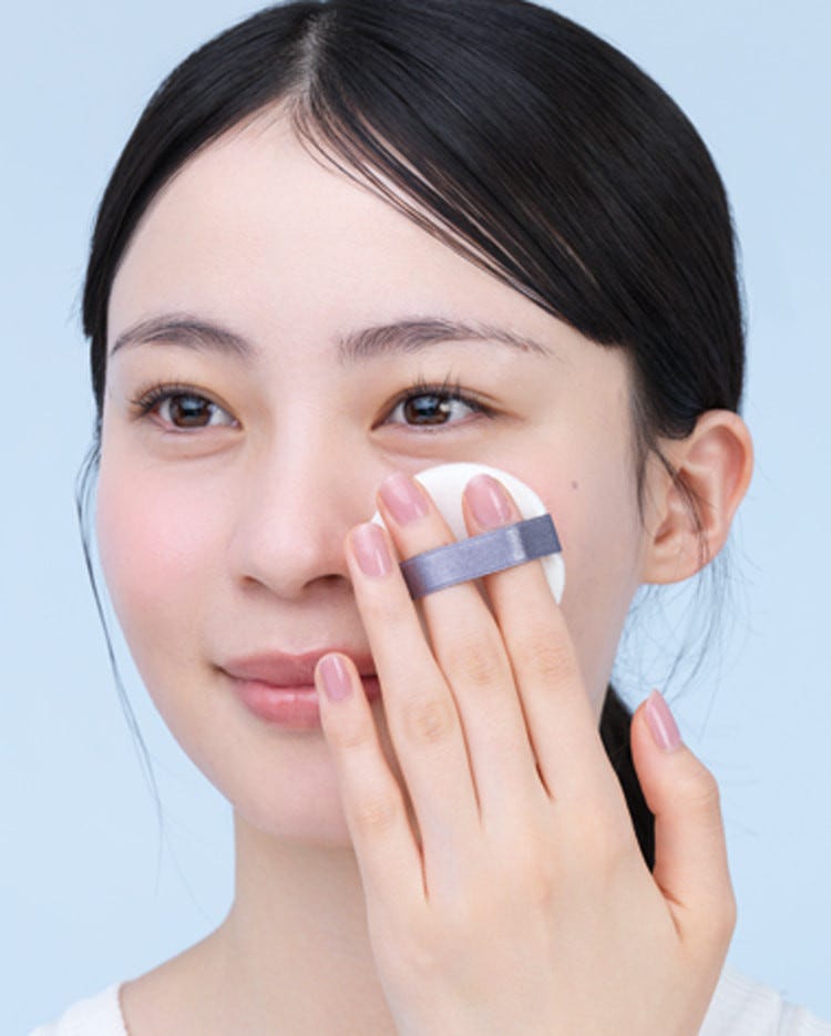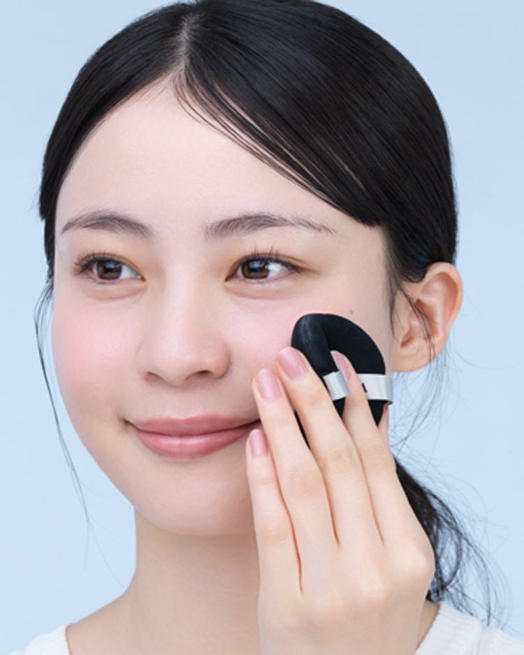 をのせ、スポンジでトントンとなじませる。中心から外側へ少しずつ塗り広げると、顔の立体感がアップ。パフにとったb