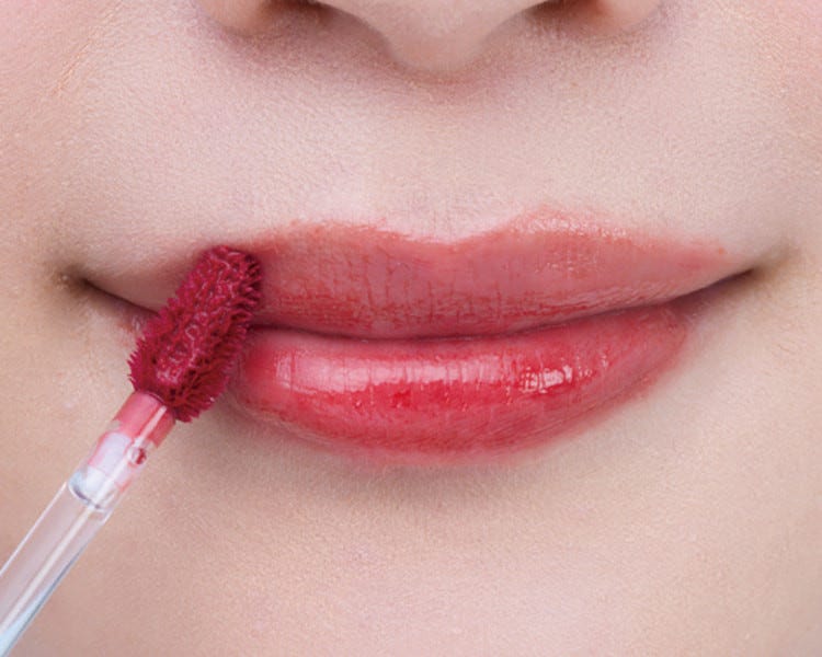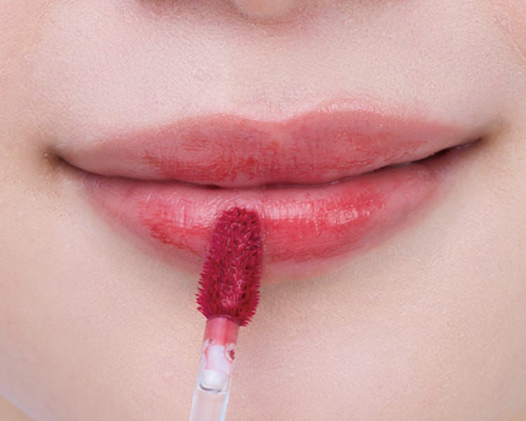 を唇全体に重ね塗り。このひと手間をかけるだけで、色の定着力も上がり、ちゅるんとした立体感も演出できる。
