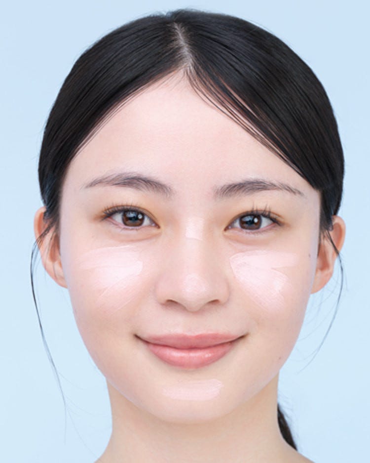 は鼻根、鼻先、目頭、ほお骨の角に塗る。指にとったものを、ポンと小さくのせるのがコツ。