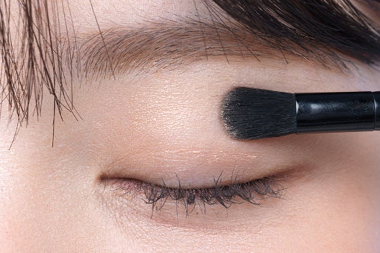 の右上を塗る。左上は上まぶたの中央、目をあけたときに見える位置にオン。照明の光をやさしく反射するラメが、全方位からの好印象をゲットするポイント。