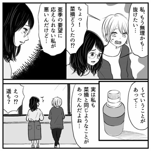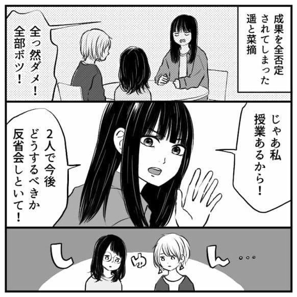主人公と友だちの菜摘は彼女に怒られると思わず、落ち込んでいる様子です。