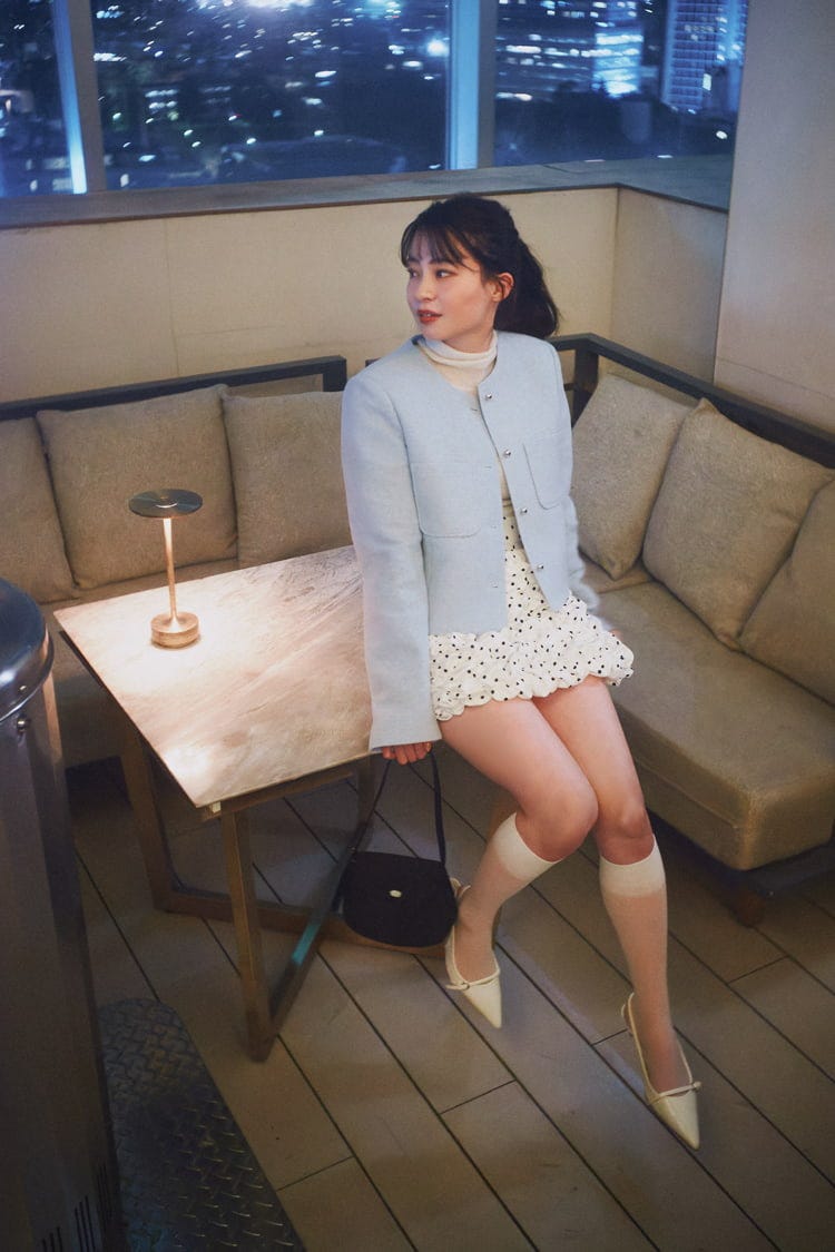さわやかカラーのジャケットが春らしさを底上げしてくれる。ミニスカートとのあわせでスタイルアップ効果も抜群!
