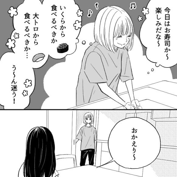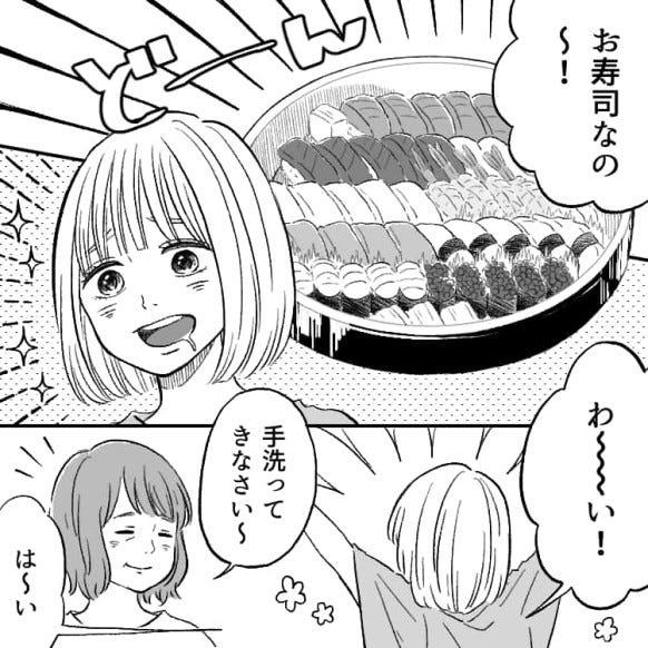 主人公が家に帰ると、なんと夕飯はお寿司でした。