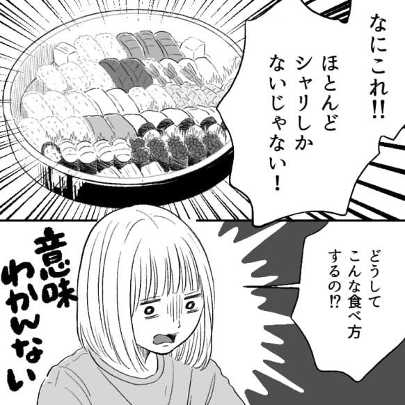 お寿司のネタだけ食べて、シャリを残す姉に怒っている主人公。