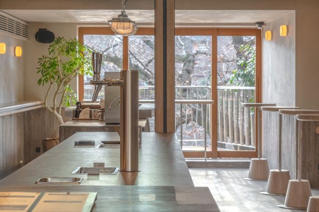 店舗は、高瀬川の桜並木と四季折々の表情を見せる鴨川に挟まれた京町家を、モダンに改装した空間。1階は、スタンディングカウンターを中心としたレイアウト、2階は大きなコミューナルテーブルをメインに、和を感じながら心地よい時間を過ごせる空間になっています。