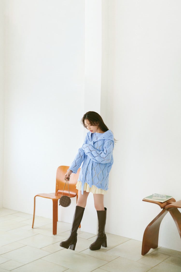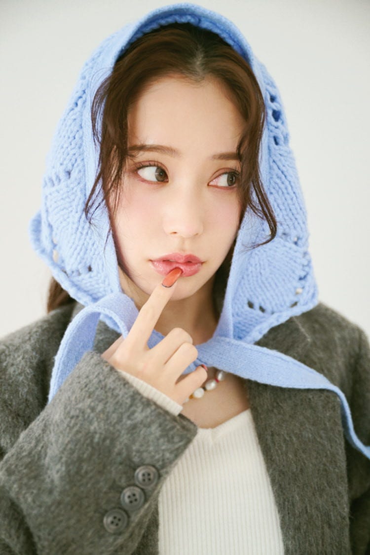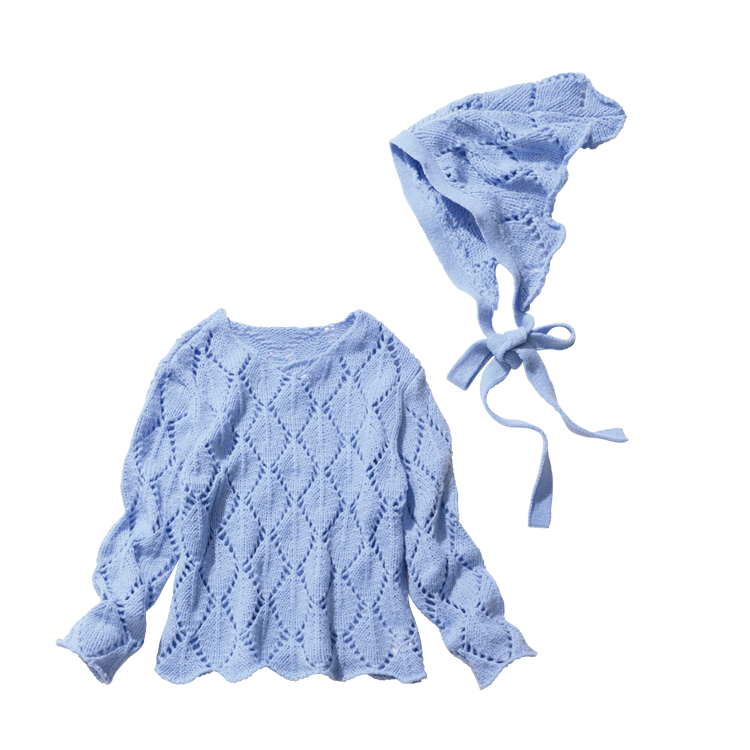 今季トレンドのニットバブーシュカはセットで賢くゲットして♡ ほっこり可愛いかぎ針編みニットは透明感アップなブルーでキレイめ要素をひとさじ。