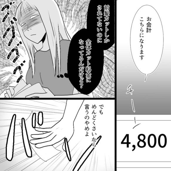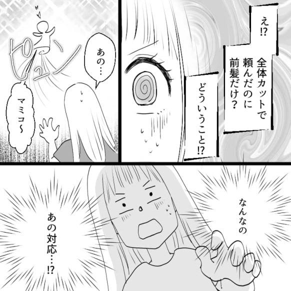 楽しみにしていた主人公でしたが、インフルエンサーのマミコちゃんの登場によりカット中にも関わらず、美容師さんに放置されてしまいます。