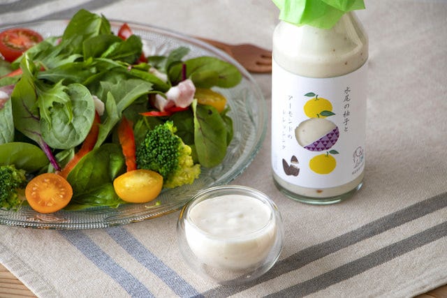 「水尾の柚子とアーモンドのドレッシング」(1,598円) 「水尾の柚子とアーモンドのドレッシング」は、京都・水尾産の柚子が持つ爽やかな香りが特徴♡ アーモンドの食感が調和し、後味はすっきりとしながらも奥行きのある風味に仕上がっています。