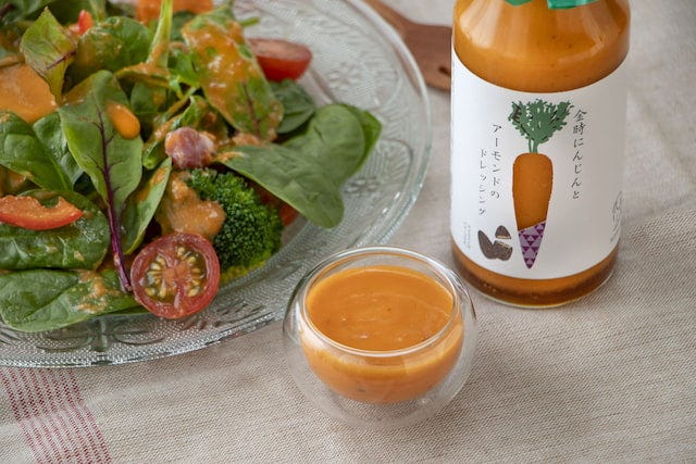「金時にんじんとアーモンドのドレッシング」(1,598円) 「金時にんじんとアーモンドのドレッシング」は、金時にんじんの自然な甘みと鮮やかな色合いに、アーモンドの食感をプラス。素材の甘さを活かしたまろやかで満足感のある味わいとなっています。