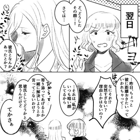 しかし、彼氏と距離を置きたいと言われたと彼女に話したところ、彼氏をバカにするようなことを言われました。
