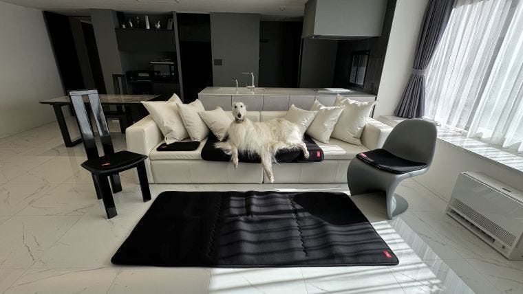 マットはペットだけでなく、高齢者や車椅子用のほか、ドライブや事務作業時、さらに災害の避難時などでの使用も想定しており、血流速度を高めてリカバリー効果があり、冷房対策や通気性(むれ防止)を備え、長時間使用しても快適だ。使用素材や使用成分にこだわるとともに犬種や体重によってマットにかかる荷重を検査するなど、品質と安全性を徹底している。加えて首輪と同素材のレザーバングルはフルオーダーメイドで色やネームデザインが選べるなど「家族の服を選ぶのと同じように楽しめるファッション性にもこだわっている」。