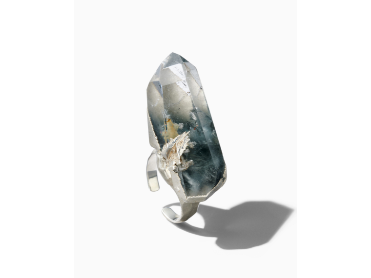 26~27年秋冬パリ・メンズファッションウィークで協業ジュエリーを着用。縄文文化をテーマの一つに据えたタークの新作に寄せ、ダイナミックな天然石原石のフォルムを生かしたリングやループタイなどをショーピースとして見せた。