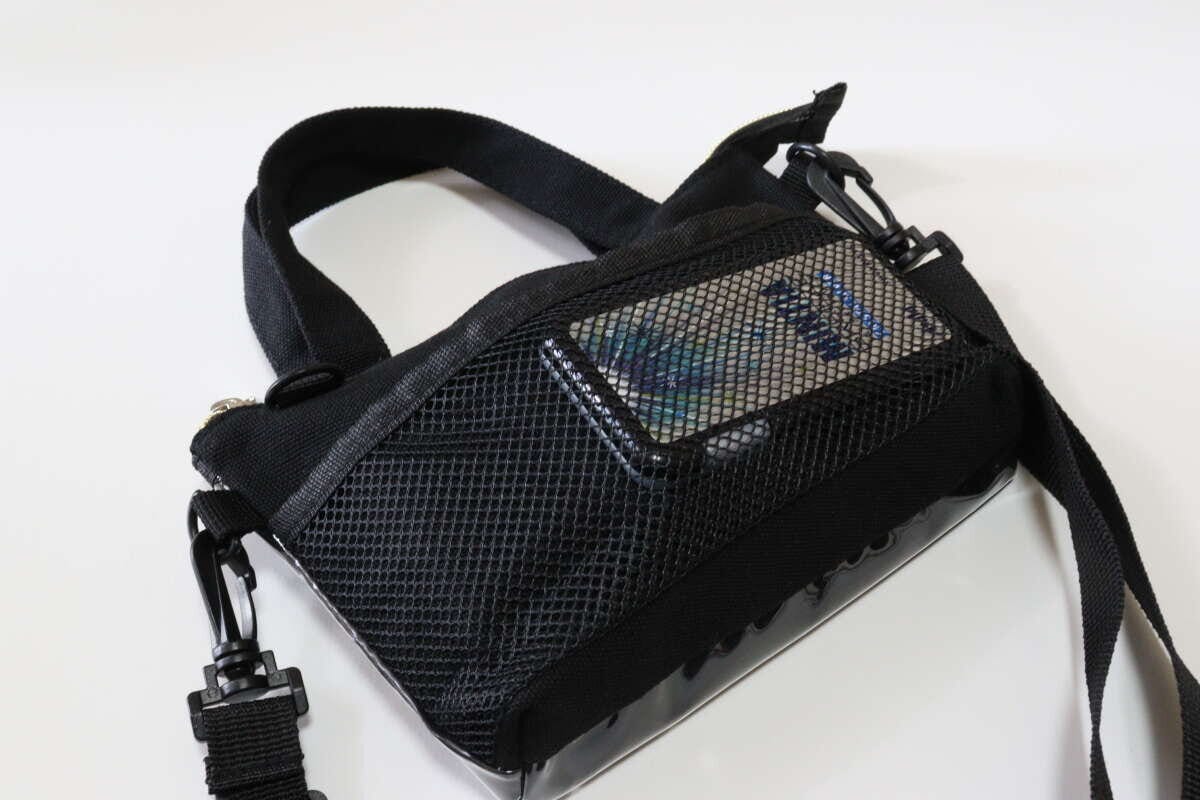見た目はシンプルなサコッシュで、サイズ感も控えめ。横幅はスマホより二回りほど大きく、必要最低限の荷物を入れるのにちょうどよさそうです。
