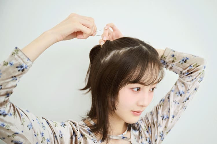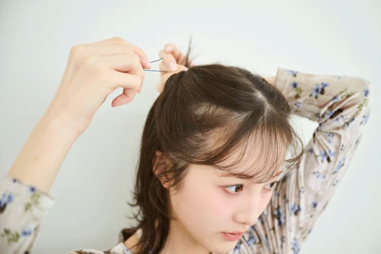 残りの分けとった耳前の髪をゆるめにねじり、1でとめたところの上にかぶせるようにしてピンでとめる。少したゆませるのがポイント。ヘアアクセがあれば、とめてある表面につけて。