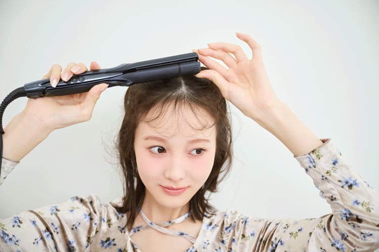 前髪全体をストレートアイロンで少し強めに内巻きにする。表面の髪を少量分けとったら、その髪を根元からはさみ、後ろに向かって丸めるようにして外巻きのカールをつける。