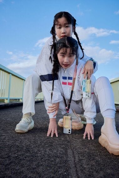 ファッションは、全てOKAMEの私服でセルフスタイリング。双子ならではの魅力が際立つ、それぞれの個性を生かした〝シミラールック〟だ。そこに、春夏のブルーやイエローのグラデーションをのせたり、クロコダイル調のPVC(ポリ塩化ビニル)ポケットが付いたスマホケースや、スマホケースやバッグにカスタムできるパラコードのストラップなどが彩りを添える。