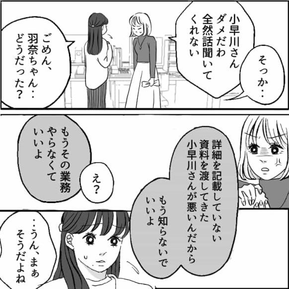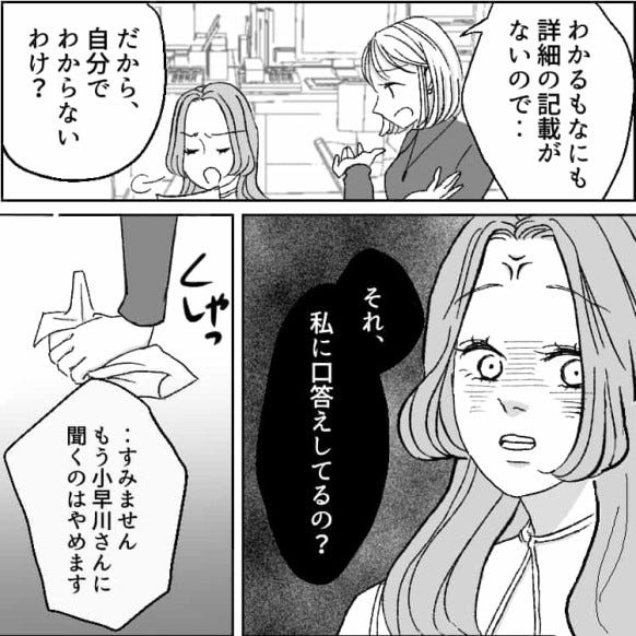 社員の小早川さんは主人公たちにはキツくあたるのに、部長にはやさしい対応をします。