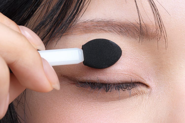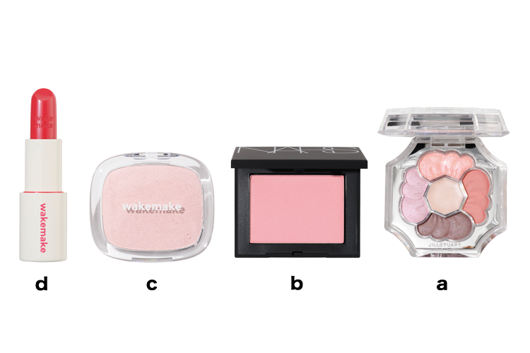 の上と左の2色をブレンドし、上まぶた全体に塗る。下目尻の三角ゾーンには、上と右の2色を混ぜてオン。目頭には青みピンクの左をトッピングし、目元の華やかさを高めて。