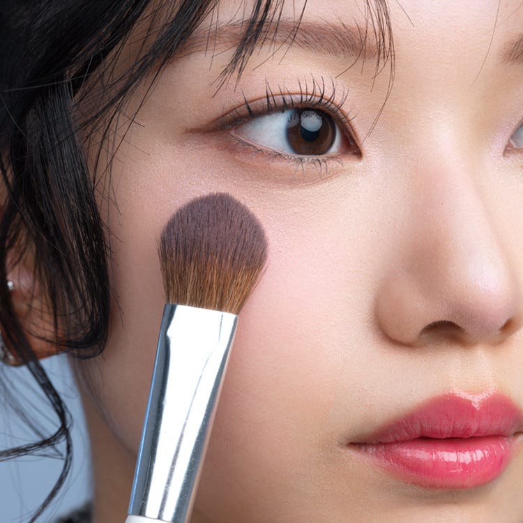 ほお骨の一番高さのある位置を起点にbを塗布。ブラシで目尻側から内に向かってトントンとぼかし広げる。