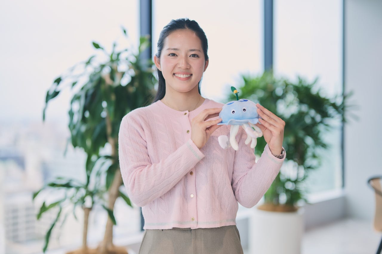 上原さんが手にしているのが、日本特殊陶業のオリジナルキャラクター「スイスイ」。