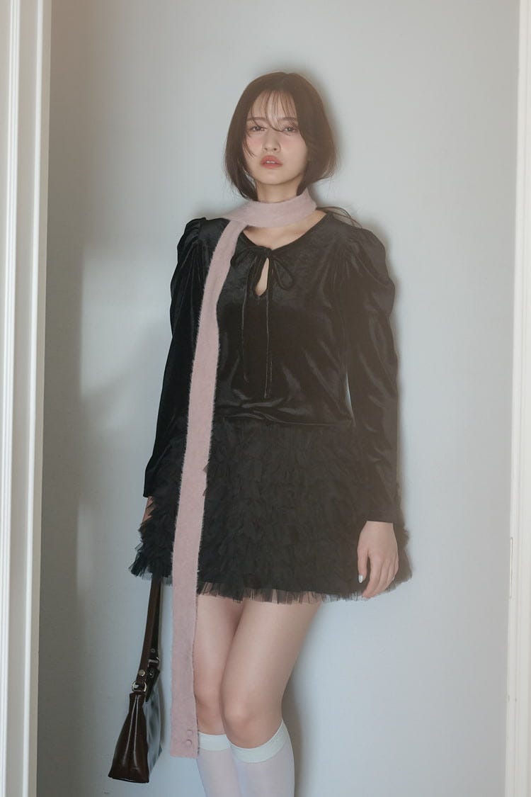 胸元のリボンにもキュンとくる、オトナな甘さのベロアミニワンピ。すそに同色のボリュームチュールがたっぷりあしらわれたデザインで、大人っぽく盛れるのがうれしい♡