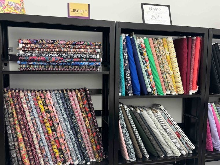 アップサイクルに使えそうなデッドストック生地やサンプル、リバティーなどの生地ブランドの新品の生地を買える部屋もある。