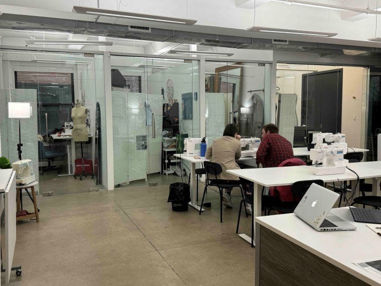 教室に習いに来るのはほとんどファッション業界とは無縁の人たちなので、混むのは平日の6時から9時と週末の10時から6時だ。それとは別に、デザイナーたちに場所や機材を使わせる別制度も設けている。1時間10ドルでスペースを自由に使えるのは、若手デザイナーにとってはありがたいだろう。もしくは月350ドルで自分用のスペースを借り、そこに材料や器具などを置いておくこともできる。