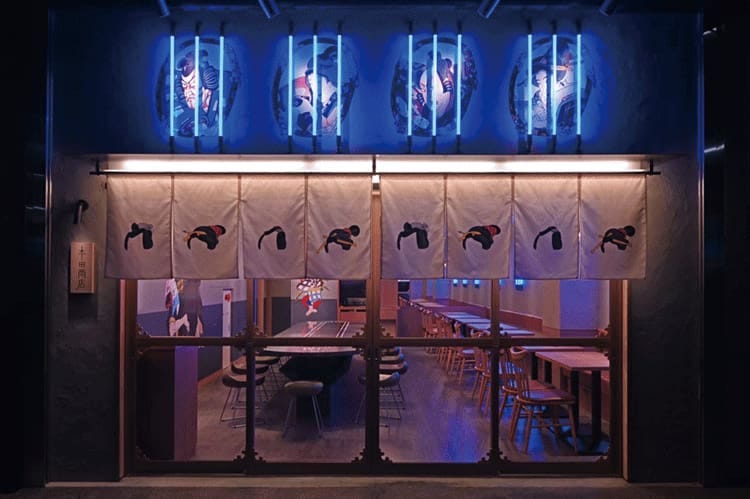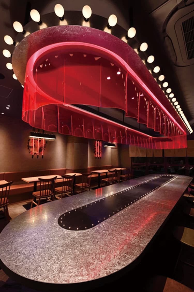 浮世絵や真っ赤なネオンなど、まるで近未来!?なエンタメ満載の店内。