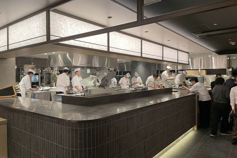 1927年に創業し、銀座エリアを中心に本格会席料理「個室会席・北大路」などを展開する大東企業が昨秋、赤坂・永田町の一等地にある「個室会席・北大路・赤坂茶寮」をリニューアルオープンした。同店は250坪・216席の大型店舗で、2~80名まで対応できる全室完全個室のつくり。同社は「板前オープンスクール」を開講するなど板前の育成に積極的で、板前の経験値を上げるために来店客に緊張感ある調理光景を披露する舞台のような位置づけで、オープンキッチンを採用した。このオープンキッチンは板前の育成とともに、調理のライブ感を演出する来店客へのサービスといった側面もある。近年オープンした新店舗でも、調理パフォーマンスを見せるオープンキッチンを採用し、外食の体験価値を打ち出す事例は増えている。同店の客単価は1万2000~1万3000円と高価格帯だが、「以前はビジネスの接待利用が中心だったが、近年は家族や親戚同士の会食など〝家族接待〟が増えている」(同)と好調だ。