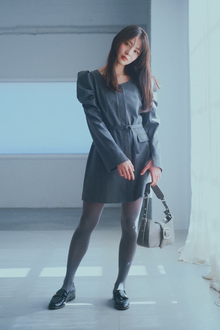 シックな雰囲気を高める、グレーのシアータイツがミソ。